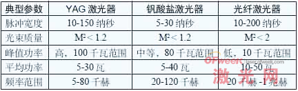 如表1所示,光纖激光器與YAG激光器、釩酸鹽激光器有著很大的區(qū)別。通常情況下,光纖激光器開始時的峰值功率較低,但是當(dāng)頻率增加時,峰值功率仍能維持的很好。使用主振蕩光纖功率放大器(MOFPA)方法的光纖激光器可以改變脈沖寬度,這有助于優(yōu)化激光打標(biāo)參數(shù)。例如在燒蝕工藝?yán)?,可以通過調(diào)整脈沖寬度找到已熔化材料和已蒸發(fā)材料的最佳比例。